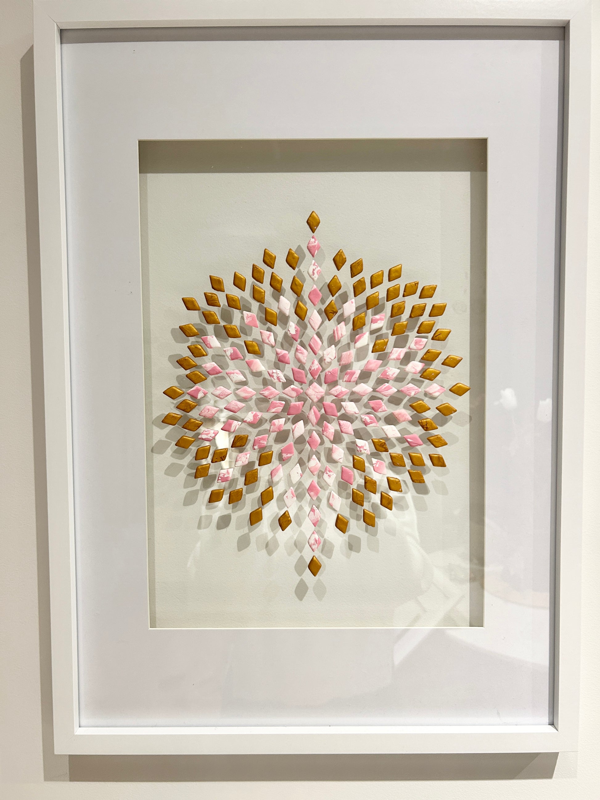 Radiant and refined, this wall piece unfolds in a starburst pattern of gold and pink marble clay, each element set upon glass to appear suspended in light.
