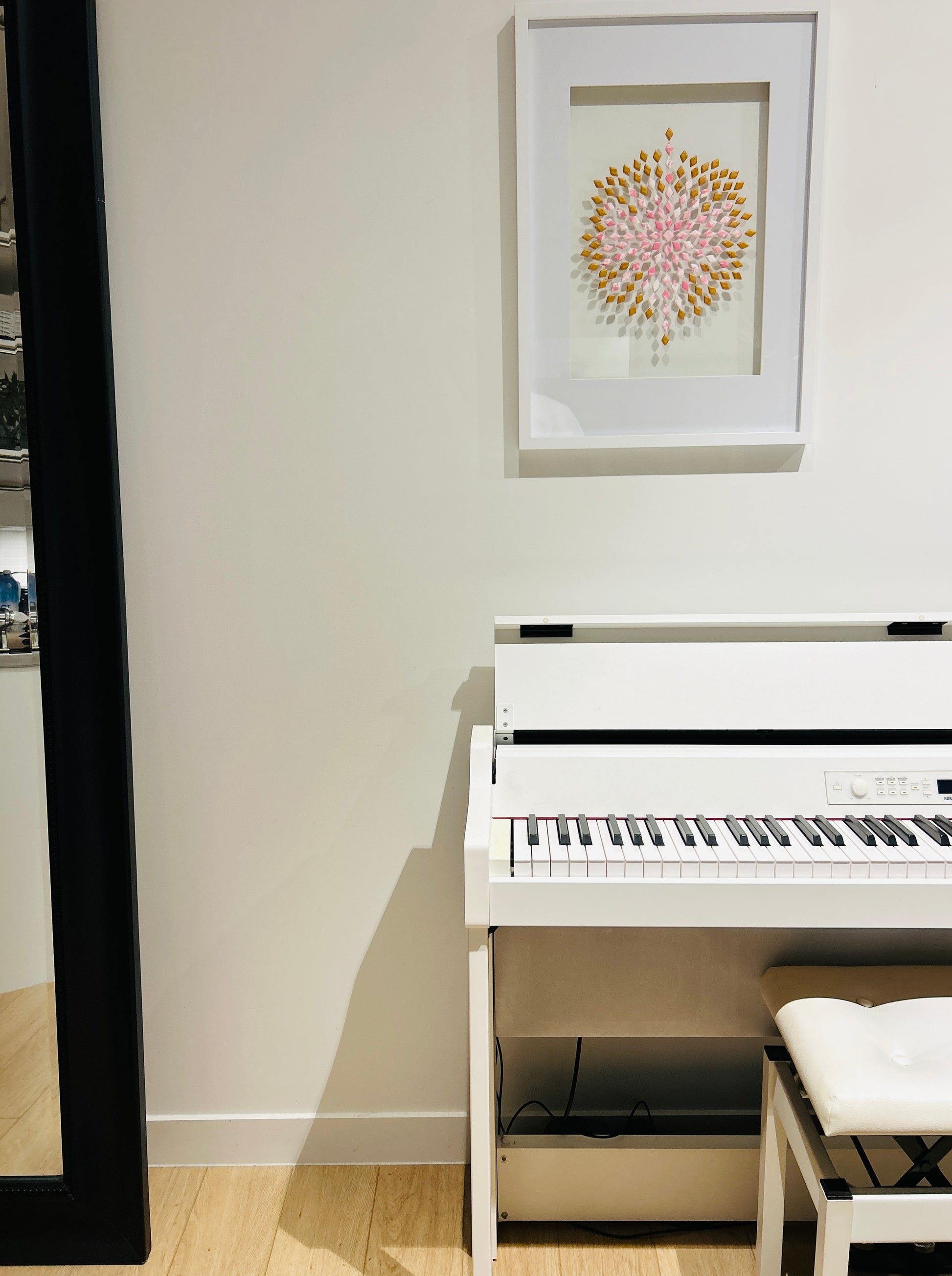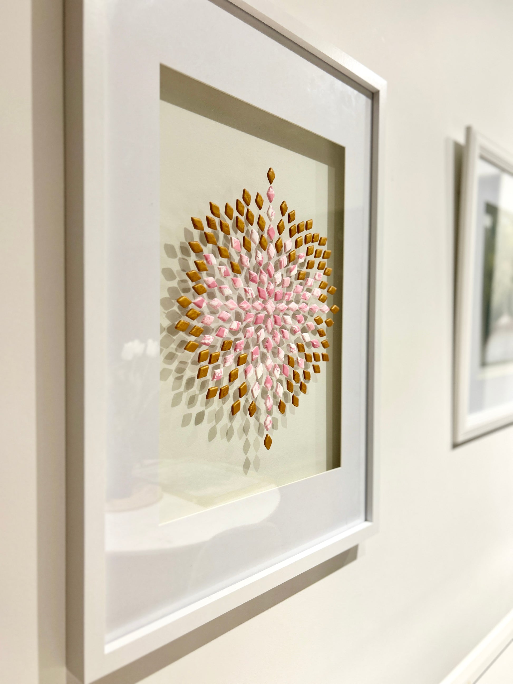 The crisp white border and frame sharpen its brilliance, allowing the colours to glow with both delicacy and strength. Soft rose tones meet gilded highlights, creating a sense of expansion and energy, as if the piece is in perpetual bloom.